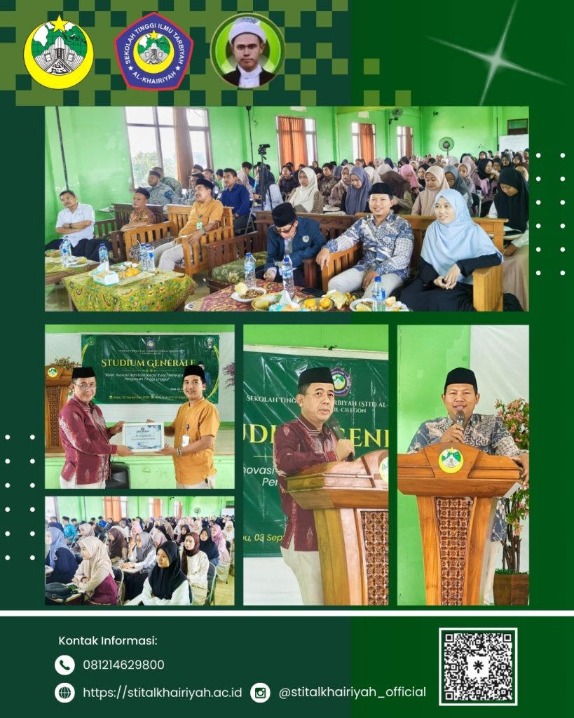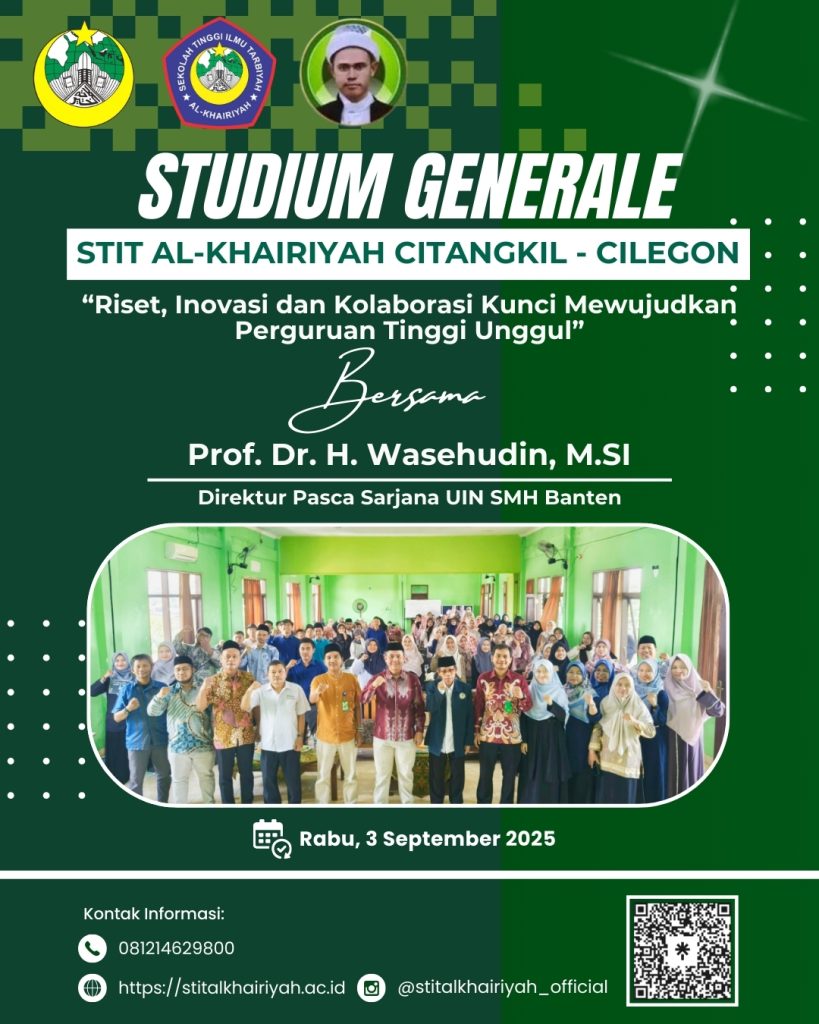 Cilegon, 3 September 2025 – Sekolah Tinggi Ilmu Tarbiyah (STIT) Al-Khairiyah Citangkil Cilegon menyelenggarakan kegiatan Studium Generale dengan tema “Riset, Inovasi, dan Kolaborasi Kunci Mewujudkan Perguruan Tinggi Unggul.” Acara ini menghadirkan narasumber Prof. Dr. H. Wasehudin, M.Si, Direktur Pascasarjana UIN Sultan Maulana Hasanuddin (SMH) Banten.